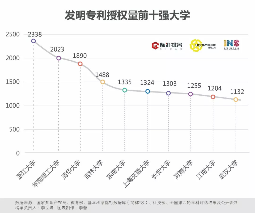 在发明专利授权量上,经济发达地区的高校更占优势。浙江大学以2338件高居首位,华南理工大学和清华大学分列二、三。长安大学、河海大学、江南大学等也挤入前十。