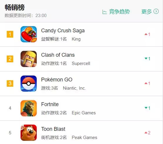 “上线一个月以来收益最多的手游”、“最快取得1亿美元收益的手游(耗时20天)”、“上线一个月后下载次数(约13000万次)”、“上线一个月后在最多国家下载次数排行第一(约70多个国家)”、“上线一个月后的收益额在最多国家排行第一(约55个国家)”,其受欢迎程度可见一斑。