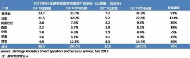 市场调研机构的数据显示,去年第四季度,全球智能音箱出货量增长了95%,达到3850万台。一个季度的出货,超过了2017年全年。