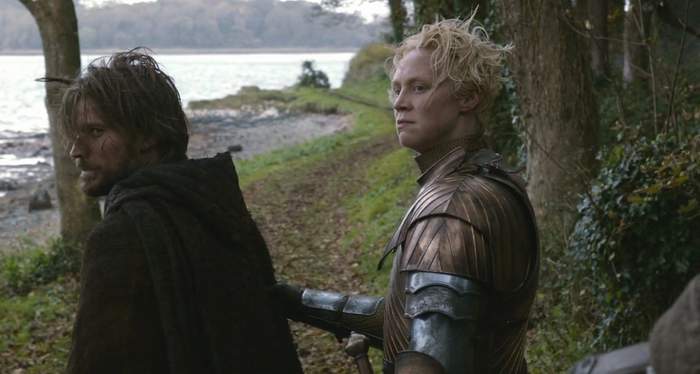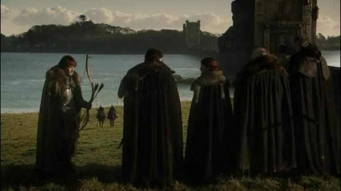 废墟坡下的林荫道上,靠山一侧,是罗柏南伐的行军营中,战俘詹姆.兰尼斯特从此逃出;靠海的一侧,“女汉子” 塔斯的布蕾妮在押解詹姆去君临途中,遭遇三个胡作非为的史塔克士兵,并将它们清理。