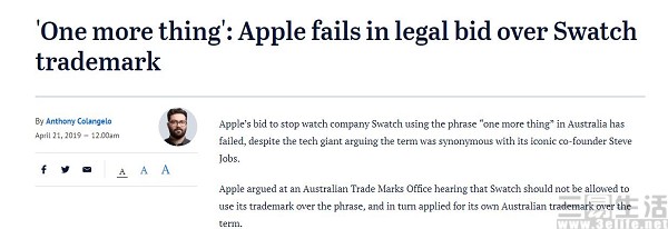 虽然说苹果与“One more thing”有着不解之缘,但很显然澳大利亚商标局的听证官并不这样认为。他旗帜鲜明的支持了Swatch的观点,认为苹果在介绍特定新品或服务之前曾使用过一次,然后就不再与该产品或服务相关,由于“One more thing”往往只是在发布会上使用,并非是苹果的专属词汇,在后续的产品宣传中也没有继续使用,因此并不具备商标属性。