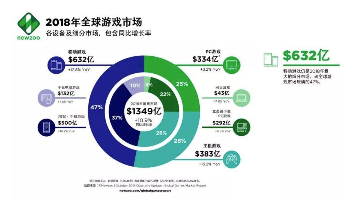 在讨论任天堂+腾讯+流媒体服务的各种难度和挑战之前,不妨先看看国外游戏市场研究机构Newzoo最新公布的全球游戏市场数据报告。Newzoo预估2018年全球游戏市场规模约为1349亿美元(低于之前的预期),其中移动游戏市场增长正在放缓,但是主机游戏市场的强劲增长正在显现。