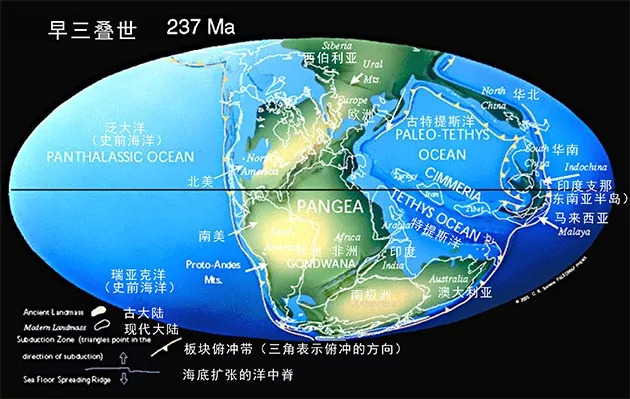 250Ma左右形成的联合古陆是距离我们最近的一次,空间分布上,联合古陆呈典型的经向半球形分布,今天我们所看到的海陆分布格局就是在此基础上裂解、漂移形成的。