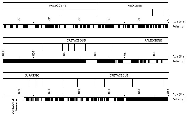 各个地质时代的岩石常都有一定的磁性,这些岩石便能记录下来它们生成时期的磁极方向。下图是地质记录,提示了过去1.6亿年间地球磁场方向的变化,黑色代表磁场与目前一致,白色代表磁场与目前相反,从图中可以看出,地球磁极的反转并无固定周期可言。