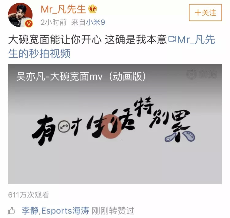 4月18日,吴亦凡发微博“搞事情ing 先吃碗面”,玩梗自己“你看这碗,它又大又圆;你看这面,它又长又宽”的黑历史。次日,吴亦凡正式发布《大碗宽面》MV,用自黑消解吐槽,可谓是漂亮的翻身仗,这首新歌也成功刷屏。