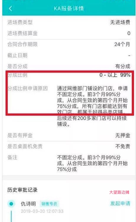 根据上面的这张怪兽充电分成申报审批截图显示,在24个月的合作期限中,该门店前三个月的分成比例为99%,第四个月开始为75%,并且是不固定分成协议。