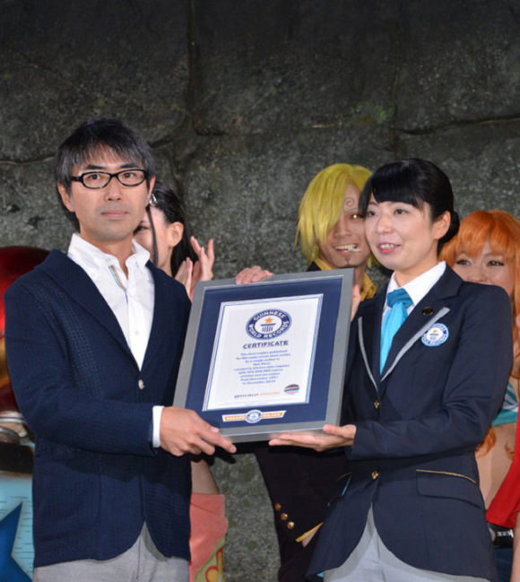 在15日于东京塔海贼王主题乐园内举行的认证仪式上,集英社《周刊少年JUMP》杂志主编瓶子吉久代表尾田荣一郎接受了日本吉尼斯官方颁发的认证证书。