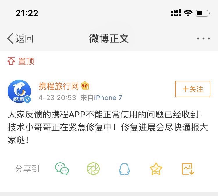 在社交网络上,也有不少网友反映遇到类似问题。随即携程旅行网官方微博回应表示,用户反馈的App不能正常使用的问题已经收到,正在紧急修复中,修复进展会尽快通报。