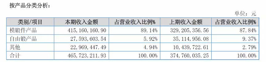 从营收构成来看,2018年模锻件产品的收入约为4.15亿,占比89.14%,同比去年有所上升。自由锻产品的收入为2,759万,占比5.92%。这两块业务的营收占比合计超过了95%。