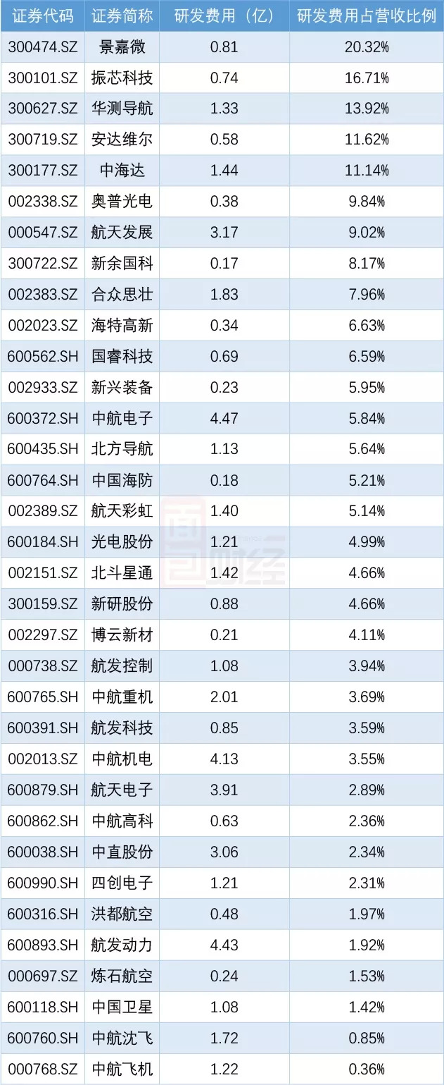 对比同属于WIND航天航空与国防分类且已披露2018年年报企业的数据可以看到,三角防务不管是在研发费用金额还是研发费用占营收的比例方面都处于相对靠后的位置。