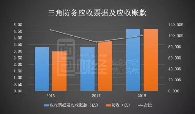 如下图所示,三角防务的应收票据+应收账款金额从2016年的3.31亿上升到了2018年的4.67亿。其中,2018年的应收票据+应收账款金额略微超过了全年实现的营收,占总资产的比重为27.14%。