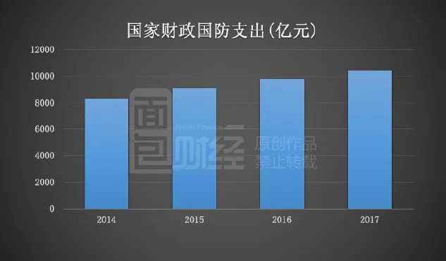 根据国家统计局公布的数据,在2014-2017年的四年间,我国的财政国防支出从8,289.5亿上升到了10,432.37亿,三年增长25.85%。同时,我国2018年的国防预算进一步提高到了11,070亿,同比增长8.1%。