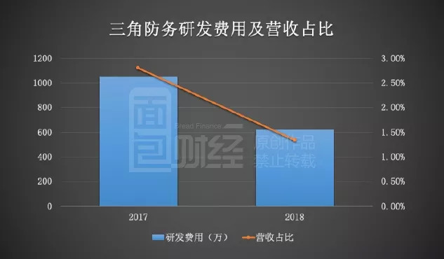 三角防务可能存在的另一个风险是研发投入相对不足。一般来说,军工行业是知识密集型产业,需要持续且数额较大的研发投入。