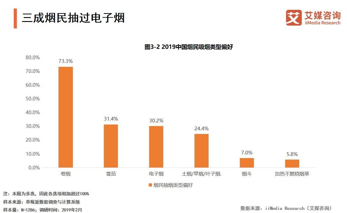 截至2019年3月,中国电子烟用户呈现年轻化、男性化趋势,他们更关注电子烟的口感(67.4%)、青睐充电型电子烟(54.4%)、偏好国产电子烟(59.6%)。