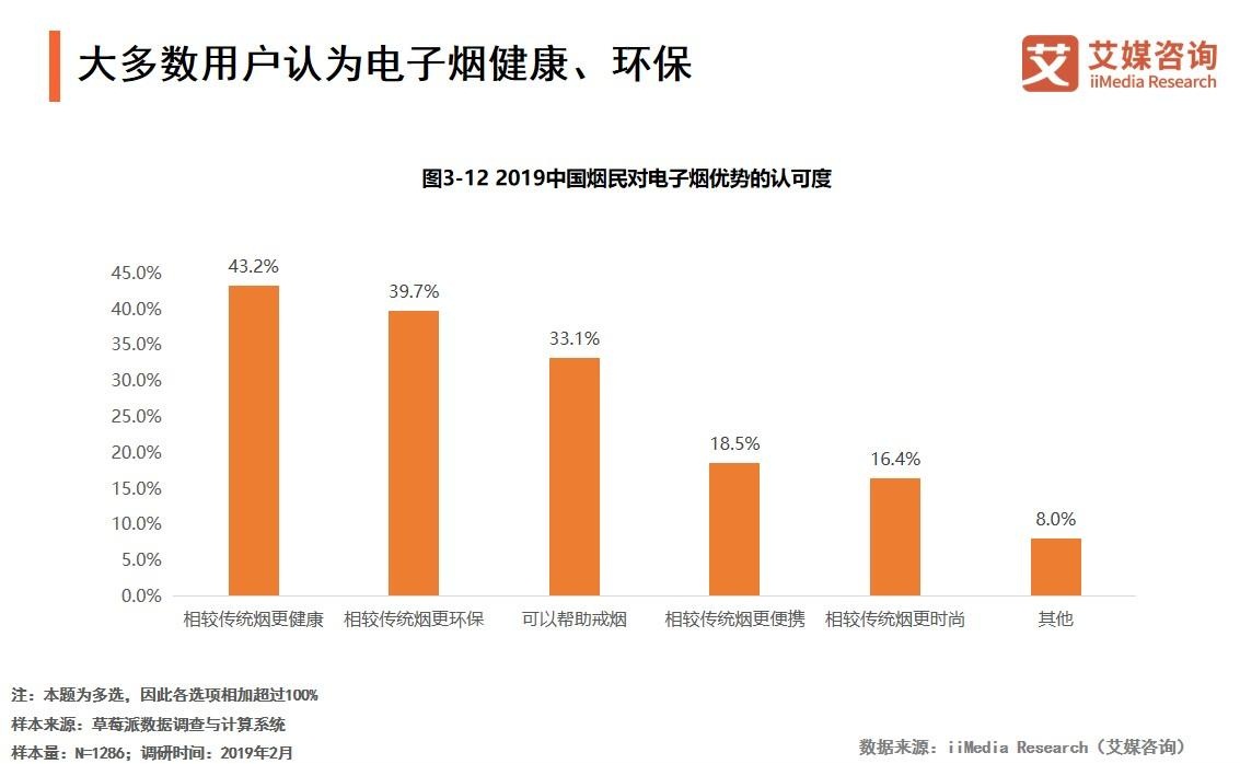 调查者中烟民认为相比于传统烟,电子烟主要具有健康、环保的特点,同时三成被调查者肯定了其帮助戒烟的效果。