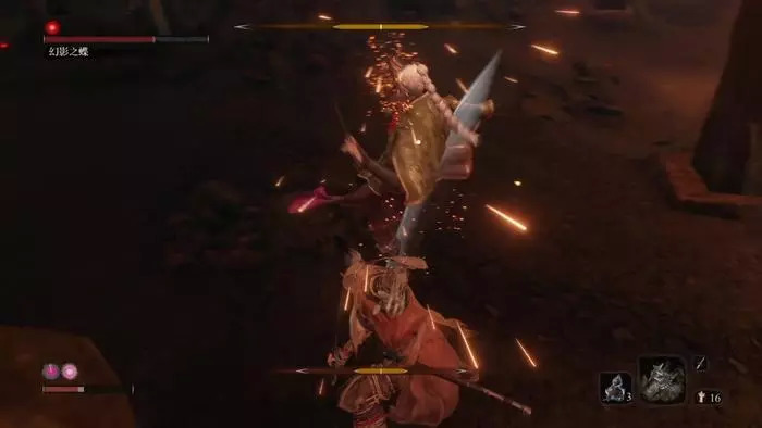 《只狼》的战斗也更接近格斗游戏,而不是慢节奏的回合制。格斗游戏的核心是立回、择和连击。《只狼》里几乎没有连击,但立回和择体现得非常明显:控制架势条需要立回,游走吸引对方出招需要立回,抓准破绽即时反击更需要立回;择就很简单粗暴,3种不能防御的攻击——突刺、下段和投技分别用看破、踩头和回避应对,完全是公式化的应对,和格斗中的投打防生克关系如出一辙。
