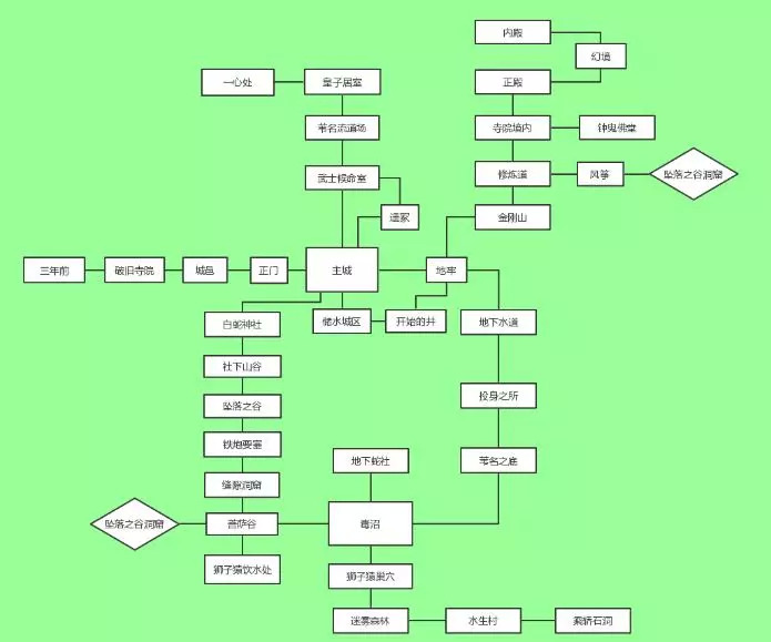 大家玩的时候可以留意一下,不同场景之间的联系确实非常少,基本上就是A区有条路去B区,B区有条路去C区,苇名城—雪山—铁炮要塞这条线体现的很明显。对比《黑暗之魂》里传火祭祀场—飞龙谷—病村—底层—小隆德—夹缝森林—黑森林等相互勾连的场景设计要简单许多。大家可以看下面的两幅图,直观感受就是,《只狼》场景之间的联系非常直接,大部分场景都只有一个入口、一个出口,交叉很少。