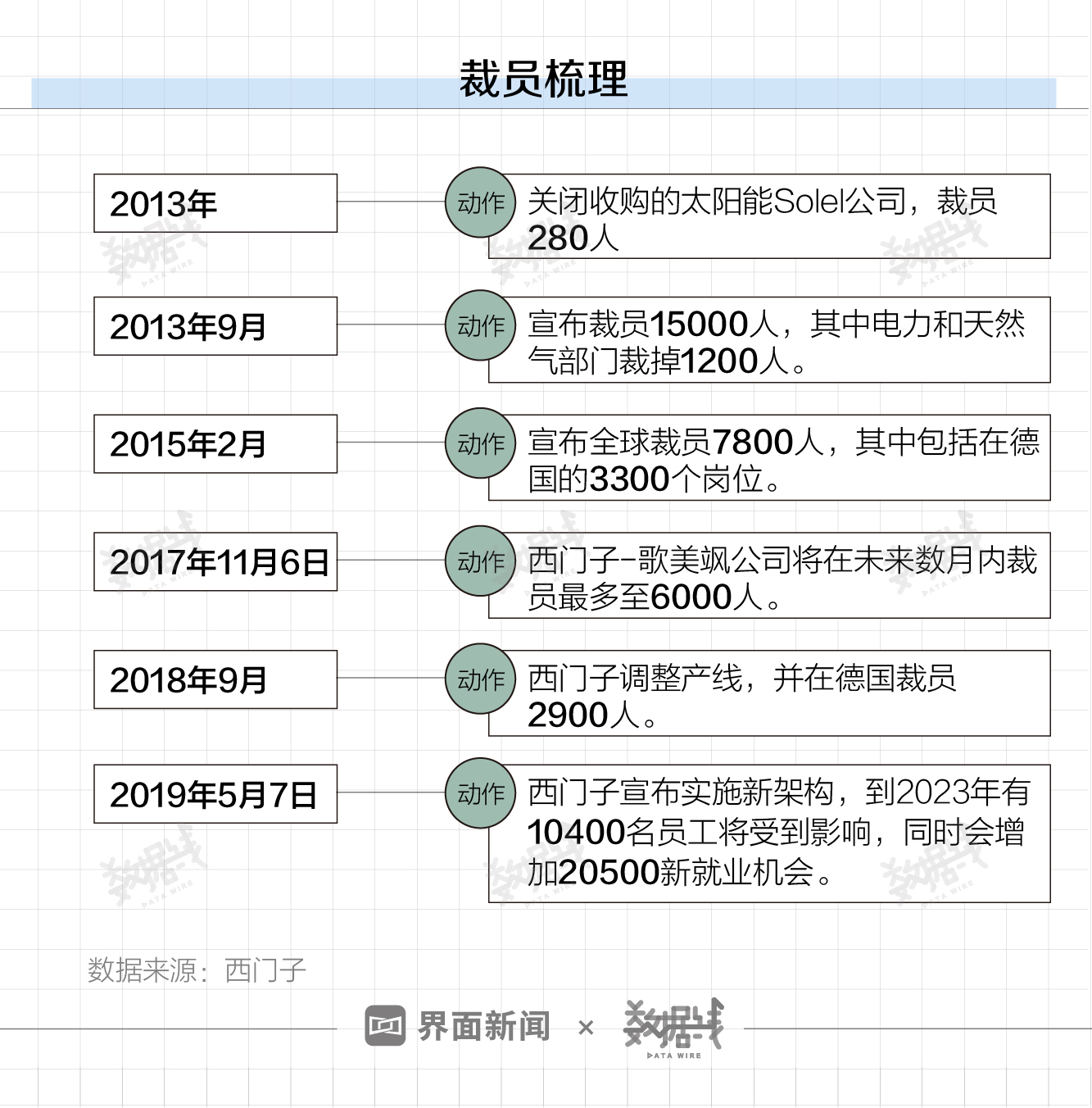 西门子计划剥离出去的油气和发电业务,业务规模达300亿欧元,涉及超过8万名雇员。约有八分之一的雇员将受到影响。西门子油气与电力集团,包括石油和天然气、常规发电、输电和相关服务业务。