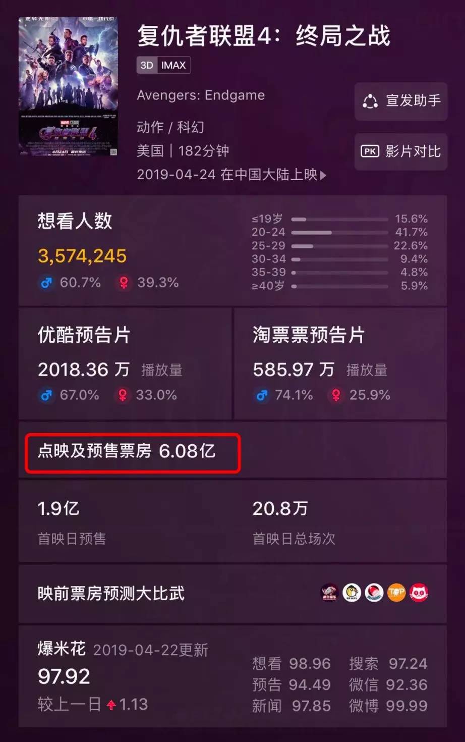 据媒体报道,《复联4》开启预售后,中国内地在10小时内预售票房就破亿。而截止到昨天(4月23日),《复联4》的预售票房已经突破6亿!