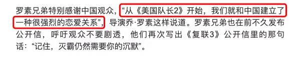 同时,《复联4》的导演罗素兄弟在多次采访中都提到对中国市场的重视,甚至用“我们和中国建立了一种很强烈的恋爱关系”来表达对中国市场的偏爱。