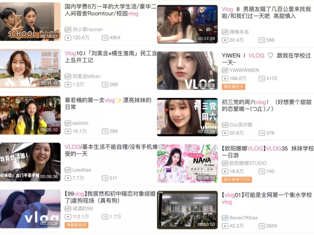 当95后、00后逐渐成为互联网主角,赋有个性化包装、讲究品质、形式新颖的Vlog恰恰迎合了其自我表达的欲望,使年轻群体成为Vlog的主要受众。加上微博、B站、抖音、小影、腾讯系等平台自上而下的推动,2018年成为vlog的井喷之年。目前,B站的Vlog日均产量可以达上千条。