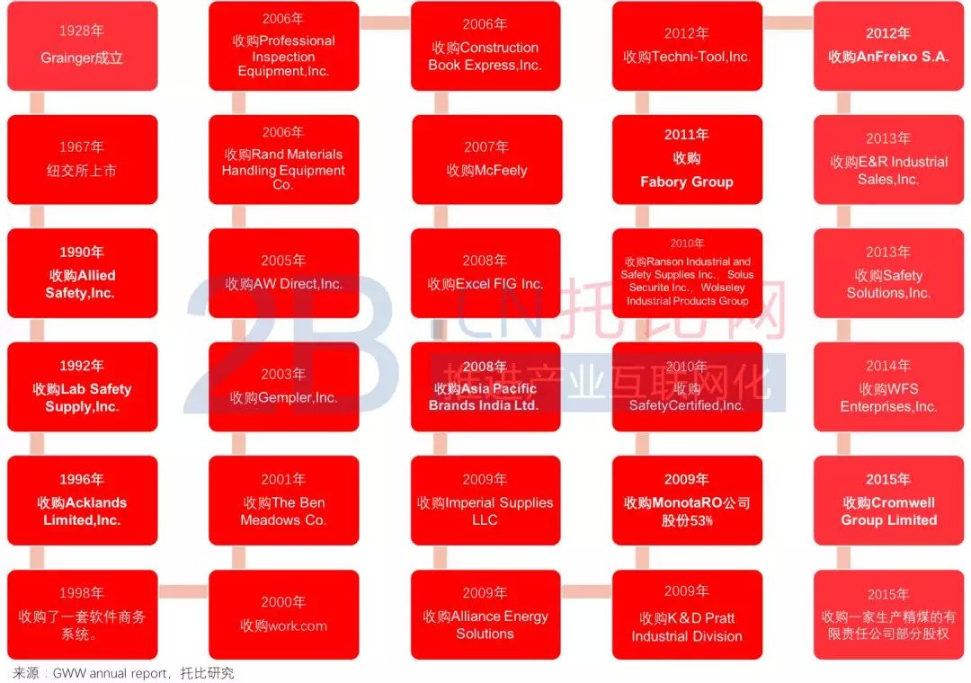 连续并购、规模快速扩张,进入国际市场。Grainger于1967年登陆纽交所,自上世纪90年代以来就一直通过对外扩张、对内重组来建立自身业务分销体系,期望补充和巩固市场地位。