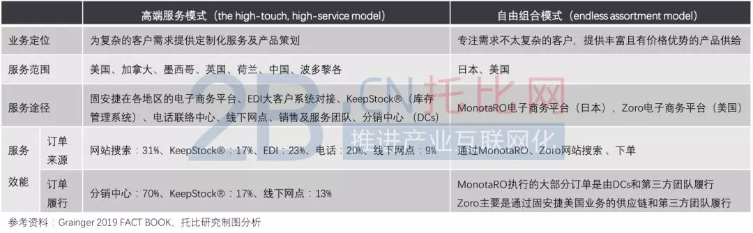 为进一步理解这两种业务模式给固安捷带来的差异化优势,我们分别从业务模式的业务定位、服务范围、服务途径、服务效能等四个层面加以解析: