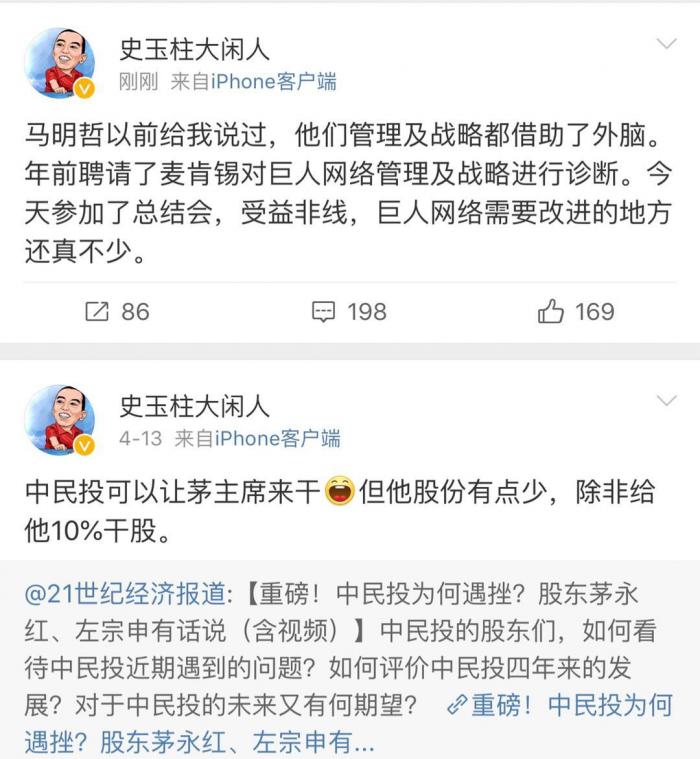 随后,史玉柱在其微博上发文称,“马明哲以前给我说过,他们管理及战略都借助了外脑。年前聘请了麦肯锡对巨人网络管理及战略进行诊断。今天参加了总结会,受益非浅,巨人网络需要改进的地方还真不少。”这一举动可能是从侧面辟谣。