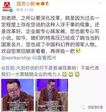 没想到,刘慈欣的这段采访还被国资小新点名了,“刘老师,之所以要深化改革,就是因为过去一定程度上存在您说的这种人浮于事的现象。”