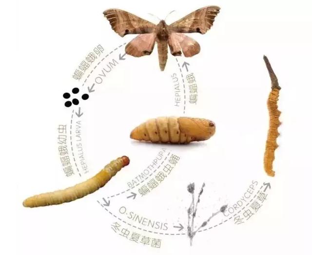 冬虫夏草实际是一种真菌,在夏天感染蝙蝠蛾的幼虫,再起体内生长,消耗掉幼虫,第二年春天真菌从虫子头部爆出,破土而出,长出常常的孢子,继续感染别的幼虫,如此循环往复。