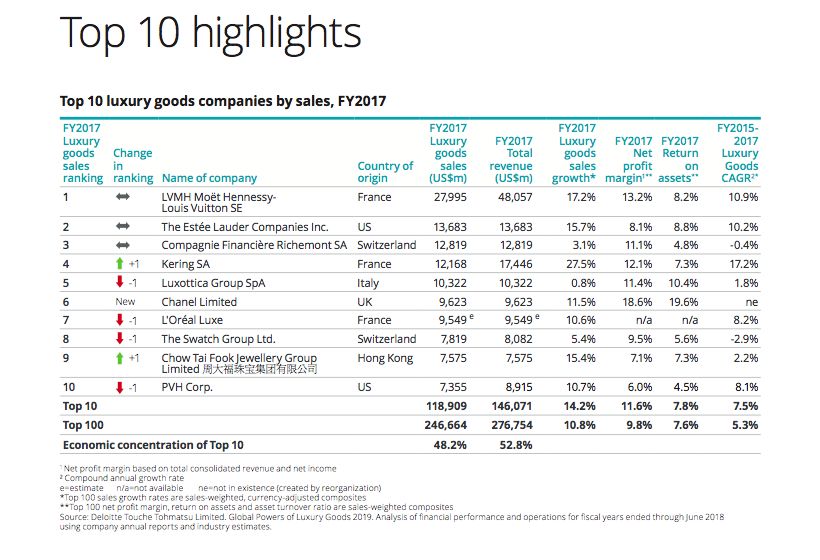 4月中旬,四大会计师事务所之一的德勤发布了一份奢侈品行业的报告,按照年度销售额,将全球奢侈品公司排座次。