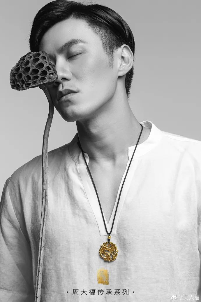 这个系列的营销一改往日土气,广告大片中的男女模特各有一张青春的脸,黑白人像的高级画面里,只有传承系列的手镯、珠串呈现出暗哑、金黄的色泽。