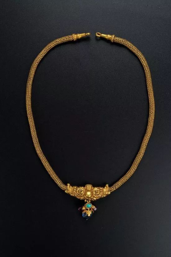 镶嵌则是将金属片做成托和爪子型凹槽,以非常隐秘的技法,以类似焊接的方式,附着在花丝作品表面,嵌以红宝、绿松、翡翠及珍珠等珍宝。