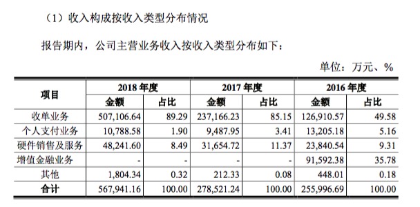 主营业务构成上,拉卡拉较为清晰:一为收单业务,二为个人支付业务。孙陶然对界面新闻记者表示:“目前上市公司的核心主营业务为第三方支付中的收单服务和个人支付服务。其中收单业务是最为核心的业务,2018年占营业收入的比重超过89%。”