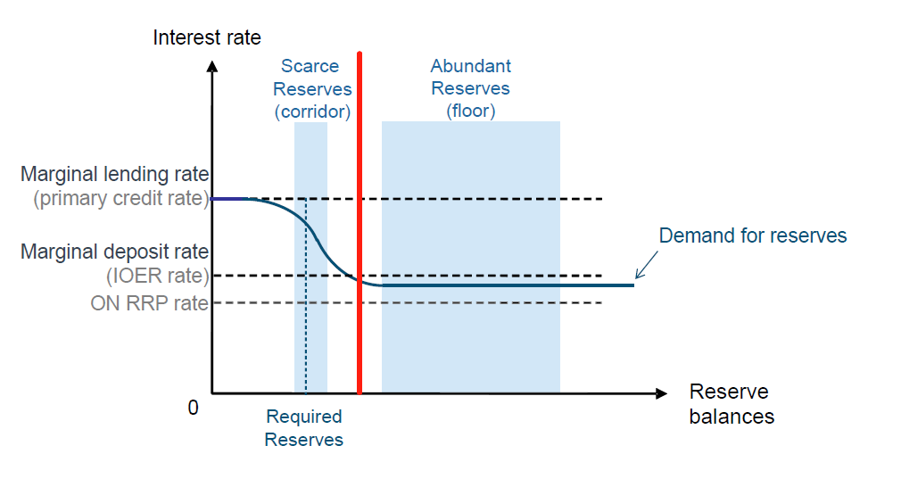 简单来说,在危机前美联储是以“走廊体系” (Corridor system) 来管理目标利率的,而危机后则变成了“下限体系” (Floor system)。