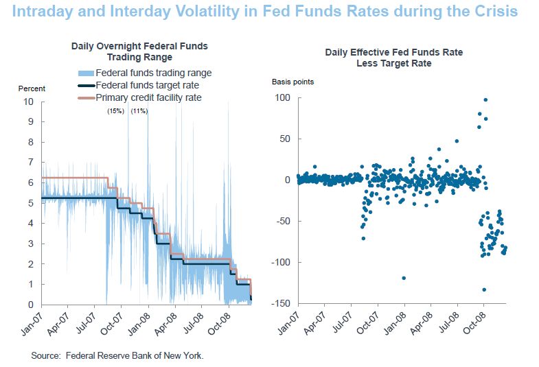 其次,从操作的角度来看,“下限体系”大大简化了美联储的工作。充足准备金减少了主动管理的必要性,因为供给或需求所受到的冲击可以轻易被吸收,从而无需每天进行大规模干预。但在危机前,每天达到联邦基金利率目标是一项具有挑战性的技术活。纽联储员工需要对未来多日影响准备金供求的各种因素大量预测,并与回购市场一级交易商进行公开市场操作,使准备金的总供应量达到目标水平。在正常时期,这或许没问题。但在影响准备金的因素难以预测的时候,利率控制变得更难。在危机的早期阶段尤其如此,当时准备金需求的大幅变化导致联邦基金利率在日内和日间都出现大幅波动 (下图) 。