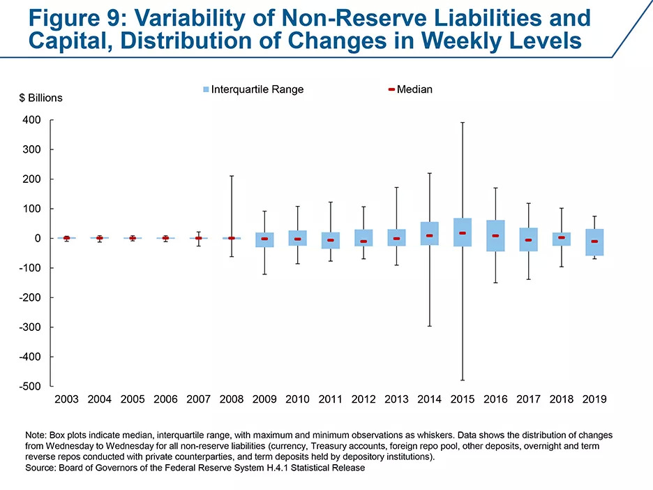 此外,还需要考虑到美联储非准备金负债变化对准备金供给的冲击 (下一节将详细讨论)。美联储的非准备金负债包括:财政部一般账户 (TGA)、海外回购池、RRP和指定金融市场公共设施(DFMU) 账户等。近年来,适应非准备金负债变化的能力变得尤为重要,因为如下图所示,非准备金负债的净变化在后危机时代更加剧烈,留有足够的缓冲十分必要。