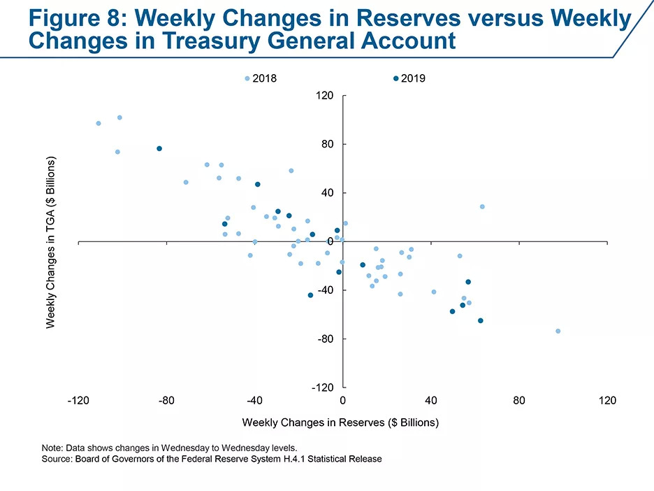 随着美联储缩表,准备金量持续减少,如果财政部维持目前的现金管理方式,TGA账户将比危机前更大,其波动性也更具冲击力。