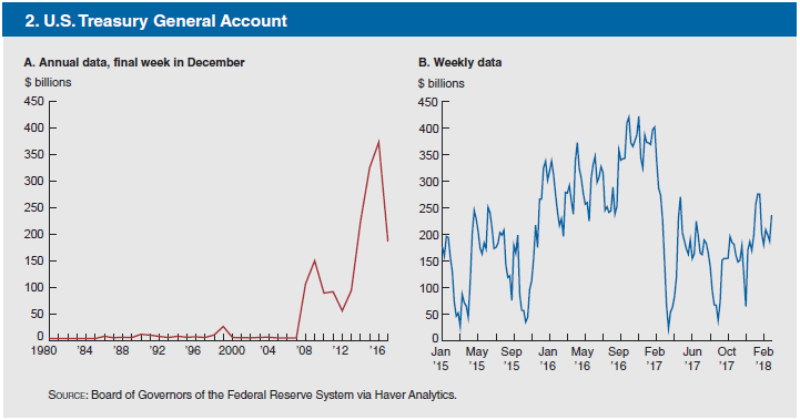 首先,政府的收入和支出天然是不稳定的。一些星期会有大笔的税收收入,而另一些星期则会有大笔支出离开账户。