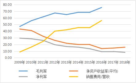 从盈利能力来看,虽然罗欣药业通过布局原料药业务,降低制剂成本,主营业务毛利率总体呈现增长趋势,2016年达到75%,但公司整体盈利能力却越来越低,其净利率一度从高达近30%持续下降至去年仅有的8.18%,且连续三年低于10%;净资产收益率(平均)亦从此前超40%下降至最近三年的15%左右。这很大程度上跟公司销售费用持续增长、加大研发投入等不无关系,如2016年其销售费用率曾高达56%,而近两年两票制实施等,行业竞争加剧,销售费用或有增无减,这恐怕也是其去年净利增长明显放缓的重要拖累因素。