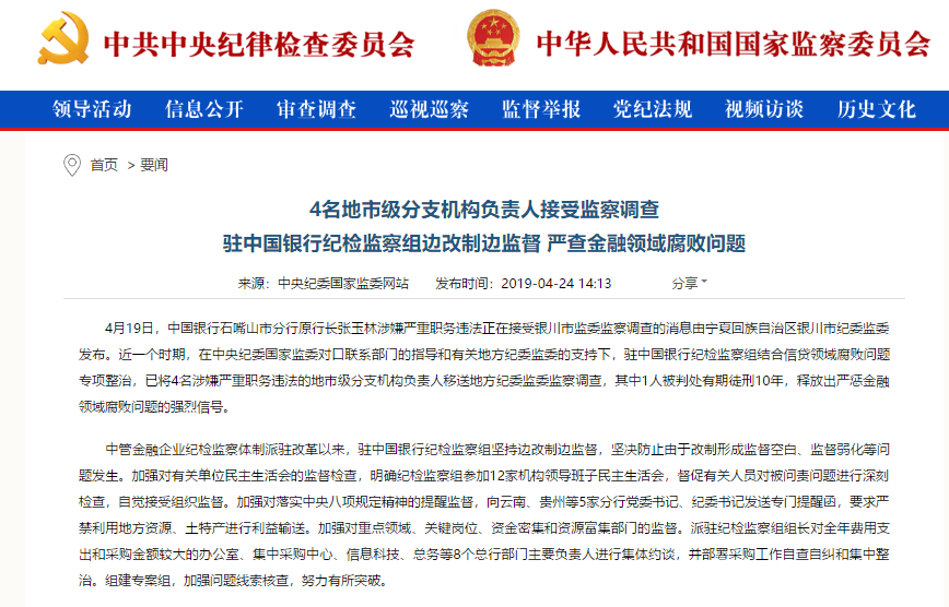 中纪委国家监察委称,4月19日,中国银行石嘴山市分行原行长张玉林涉嫌严重职务违法正在接受银川市监委监察调查的消息由宁夏回族自治区银川市纪委监委发布。近一个时期,在中央纪委国家监委对口联系部门的指导和有关地方纪委监委的支持下,驻中国银行纪检监察组结合信贷领域腐败问题专项整治,已将4名涉嫌严重职务违法的地市级分支机构负责人移送地方纪委监委监察调查,其中1人被判处有期徒刑10年,释放出严惩金融领域腐败问题的强烈信号。