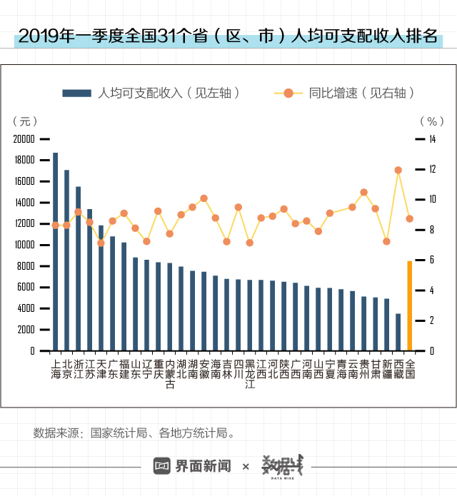 2019年第一季度,我国居民人均可支配收入8493元,比上年同期名义增长8.7%,扣除价格因素,实际增长6.8%。31个省(区、市)中,有9个省份的居民人均可支配收入超过全国平均水平。
