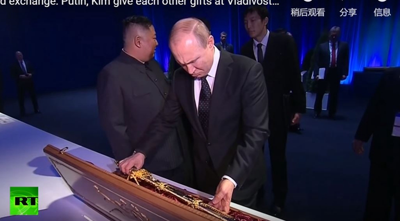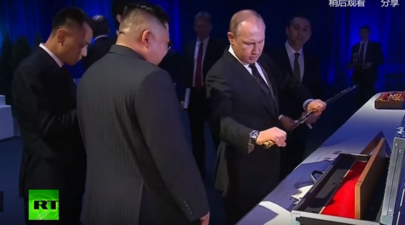 金正恩则向普京赠送了一把朝鲜宝剑,并效仿普京,也随剑给了普京一枚硬币。金正恩称,宝剑“代表了我和朝鲜人民的力量和灵魂,我们都支持你”。