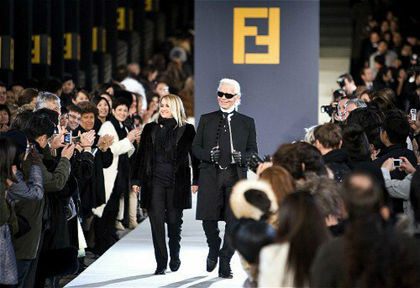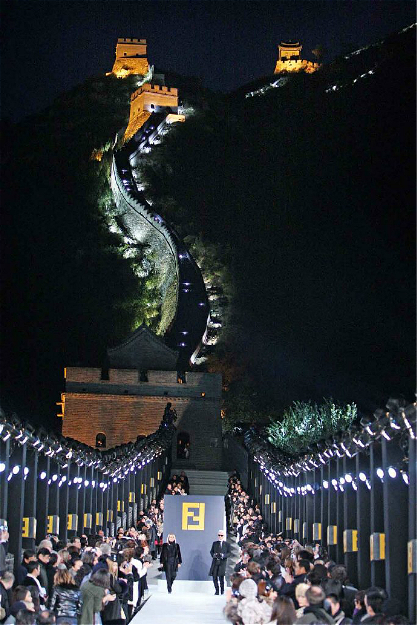 Fendi就曾在中国办过大秀,大秀地点选在了北京。那是2007年10月19日的日落时分,在长城上,冷风中的Karl Lagerfeld蜷缩在绒面革扶手椅中,腿上盖着一条编织的俄罗斯紫貂。他戴着黑色手套,穿着Kris Van Assche的黑色对襟大衣,透过墨镜看着眼前的一切。