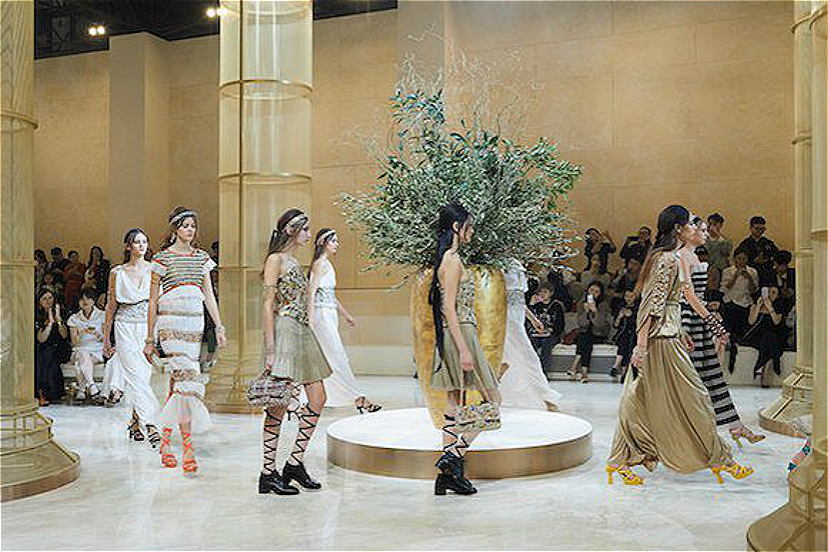 一个明显的变化是,过去的大秀基本都是“复刻秀”。例如CHANEL在成都秀场上,用重新铺大理石花纹地砖、以细网格包成柱子等方式,“搭建”了一座古希腊神殿。重新了这个系列在巴黎大皇宫首发时的场景。