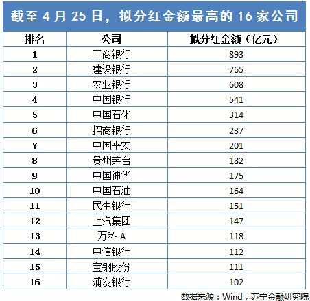 截至4月25日,A股有2063家上市公司发布现金分红预案,分红规模高达10050亿元,其中,拟分红金额超过100亿的企业有16家(参见下表)。