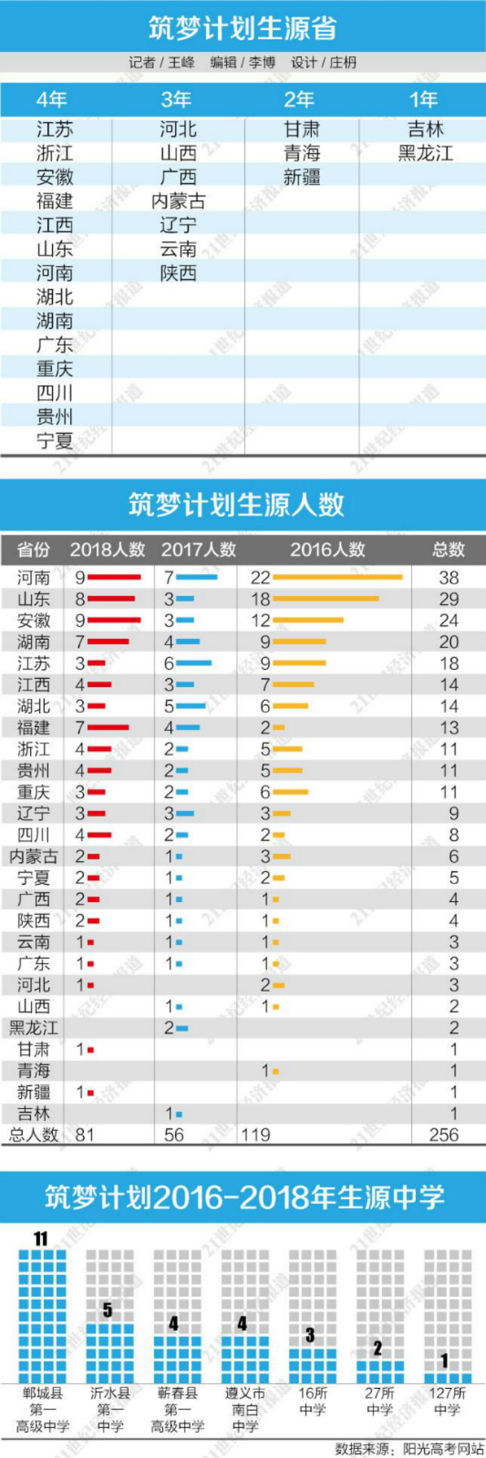 河南、山东2016-2018年筑梦计划录取人数位列前两位,分别为38、29人。21世纪经济报道记者梳理发现,这些学生分别来自23、17所高中。分布相对分散,体现了一定的公平性。