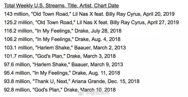 据尼尔森音乐数据显示,Lil Nas X的单曲《Old Town Road》以1.252亿(下降12%)美国地区的播放量,连续第三周霸榜Billboard HOT100。这也是4月5日与Billy Ray Cyrus的合作(1.43亿次点击)后,有史以来的第二好成绩。