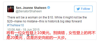 因此,将有一位女性头像被印上10美元。同时,雅各布·卢说将以某种方法在10美元纸币上保留美国开国元勋之一、第一任财政部长汉密尔顿。
