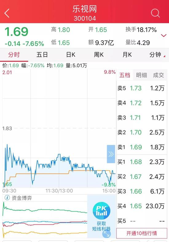 4月25日早盘,乐视网打开跌停,随后跌幅有所缩小,目前跌4.92%。此前已连续三个交易日跌停,截至收盘股价为1.69元/股,总市值约67亿元。